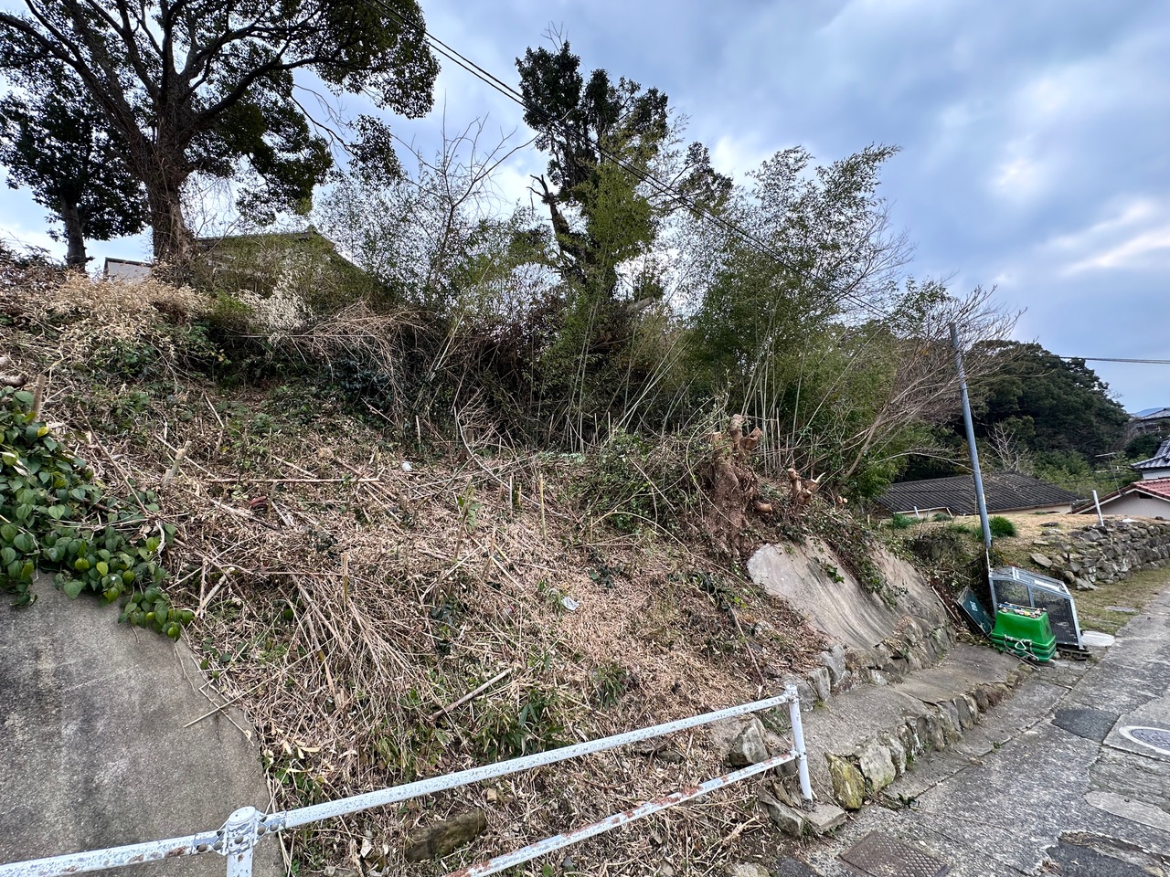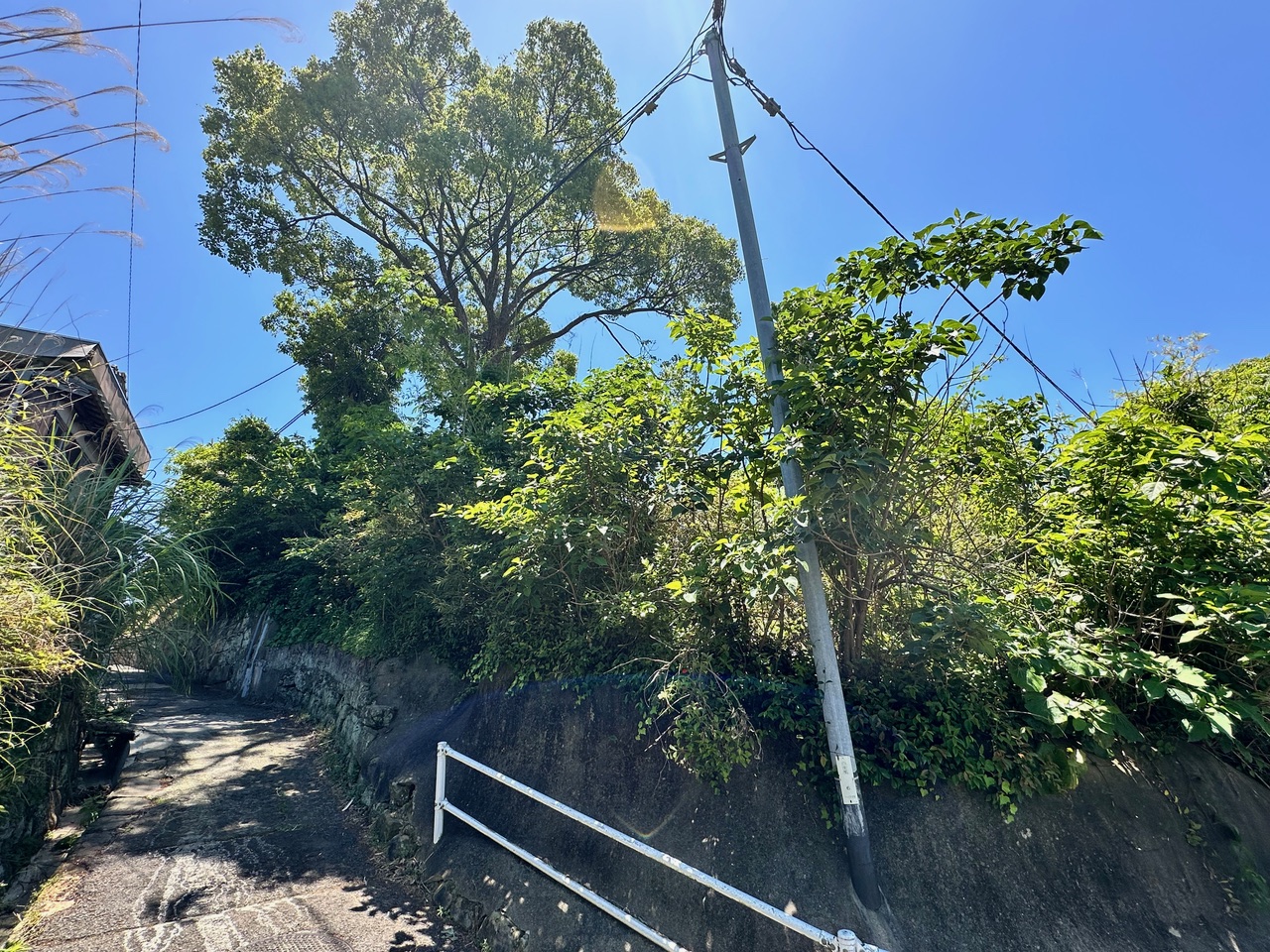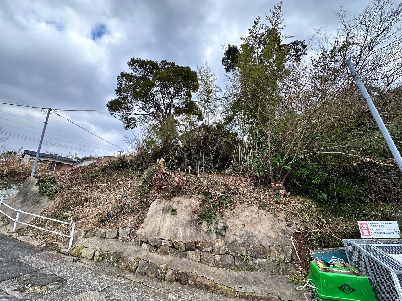 この山林は道普請をした場所の側面の石垣部分に該当する箇所であり、その石垣の上の土地には大木が成長してしまって、根が石垣を破壊する勢いに成長している。近隣住民のKさんの話では、風が強い日には大木が大きく揺れて、根っこも揺れるので石垣が動いているのが分かるという話である。九州電力の電線が通る場所であれば、九州電力に山林の所有者Kさんに対して樹木の伐採を働きかけるのだが、残念ながらこの場所には九州電力の電線が通っていないので、市役所の建築指導課のIさんとMさんに現地を確認してもらって、石垣が崩壊する危険性のある大木の伐採を山林所有者Kさんに働きかけてくれるように依頼した。