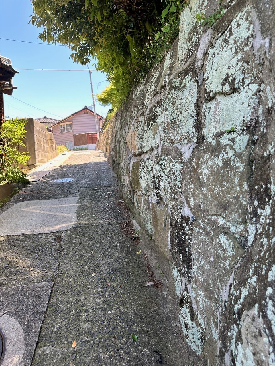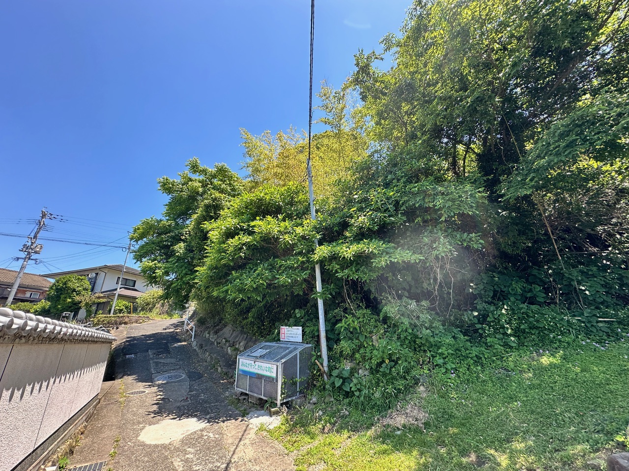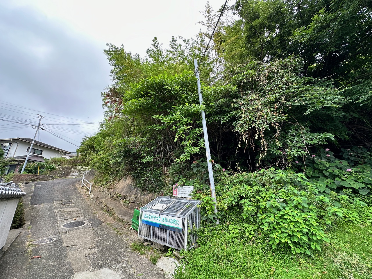 この山林は道普請をした場所の側面の石垣部分に該当する箇所であり、その石垣の上の土地には大木が成長してしまって、根が石垣を破壊する勢いに成長している。近隣住民のKさんの話では、風が強い日には大木が大きく揺れて、根っこも揺れるので石垣が動いているのが分かるという話である。九州電力の電線が通る場所であれば、九州電力に山林の所有者Kさんに対して樹木の伐採を働きかけるのだが、残念ながらこの場所には九州電力の電線が通っていないので、市役所の建築指導課のIさんとMさんに現地を確認してもらって、石垣が崩壊する危険性のある大木の伐採を山林所有者Kさんに働きかけてくれるように依頼した。