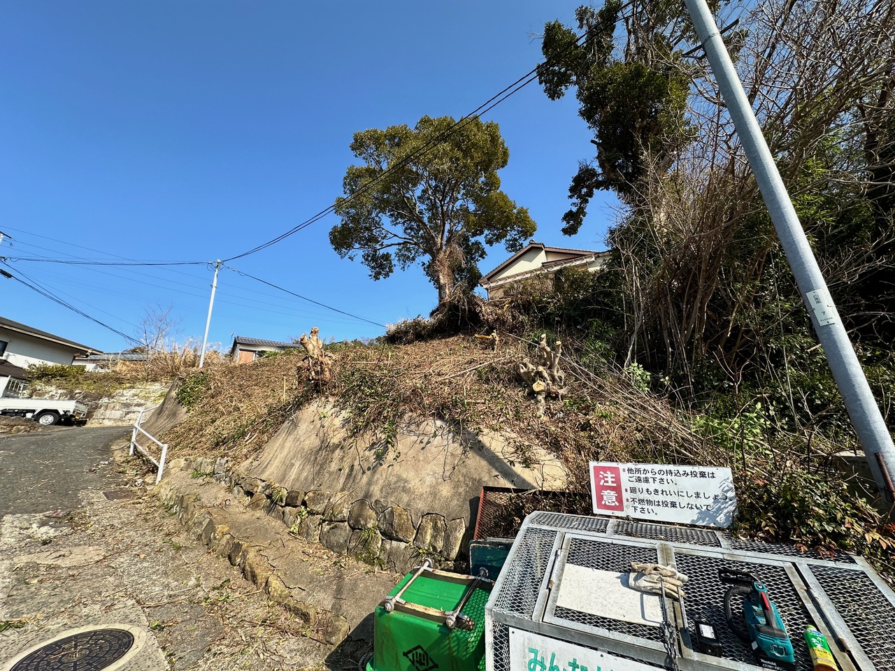 昨年ハゼの木を伐採しようとしたが、竹やツタ、野バラに行く手を阻まれて綺麗にできなかったので、再度挑戦した。所有する電動工具をフル活用して斜面の雑木を切り倒した。足場も悪く、バラのトゲに邪魔されながら、ハゼの木は完全除去することができた。今回は近隣住民のKさんから電源をお借りして作業がとても捗った。残りの雑木は2月にKさんと3人で綺麗に伐採する約束をした。