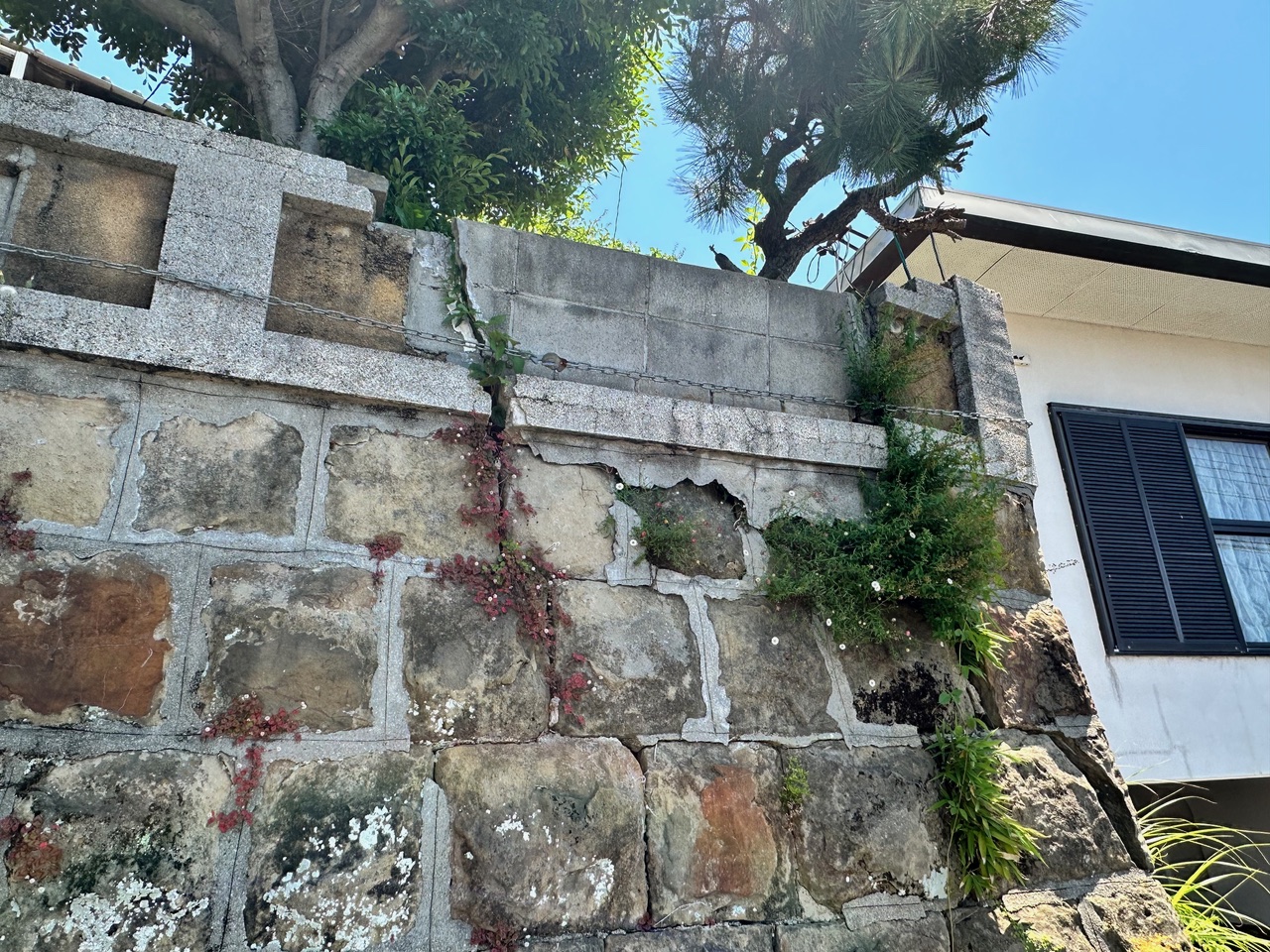 庭木が大木となって根が石垣を壊し始めていた。チェーンで崩落しないようにしているのが危険である。