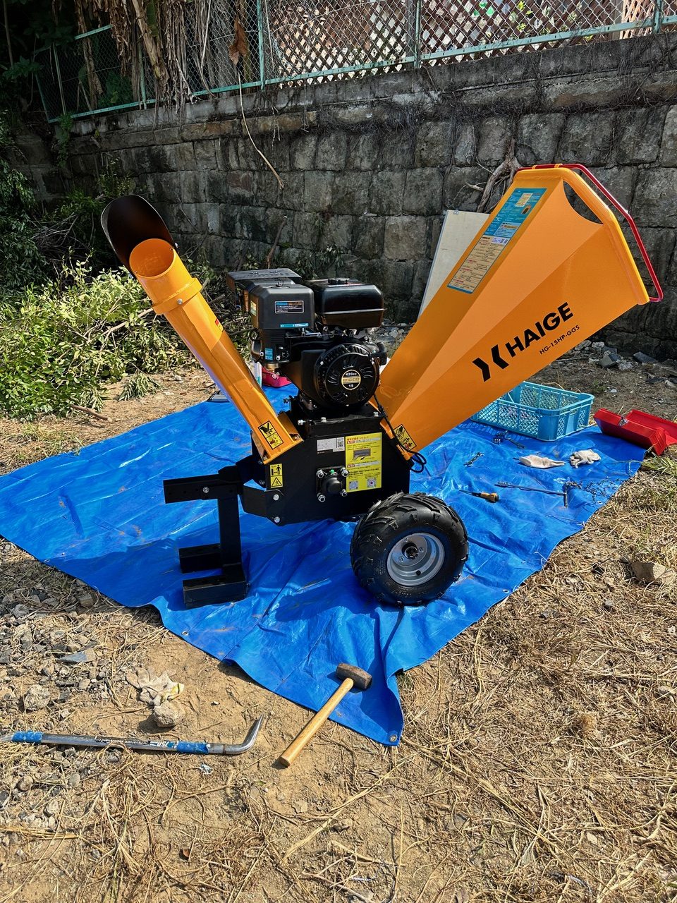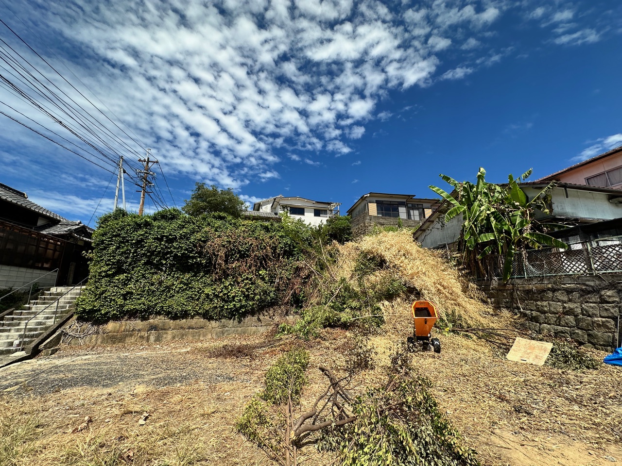 土地一面に竹が数百本、足の踏み場がないほどに生い茂っており、とりあえず端から伐採して、隣のみんなの広場に上から放り投げるという作業を約1ヶ月かけて行った。伐採した竹は燃やすこともできず、燃えるゴミに出すわけにもいかないので、ウッドチッパーで粉砕して、みんなの広場やEさんの空地にウッドチップを撒くことに決めた。そこでYoutubeでいろんなウッドチッパーを比較検討したところ、ハイガーのウッドチッパーが性能の割には低価格だったので、購入した。
